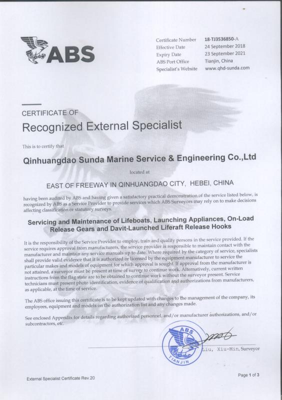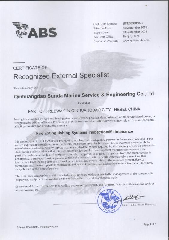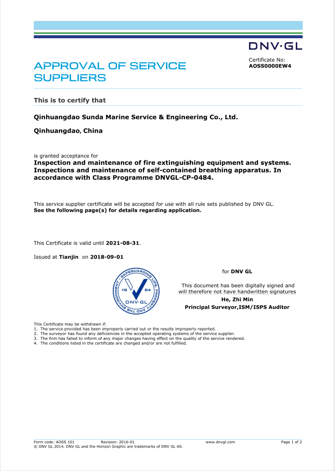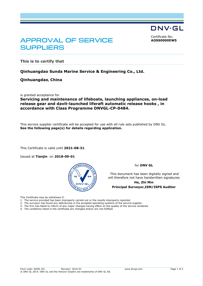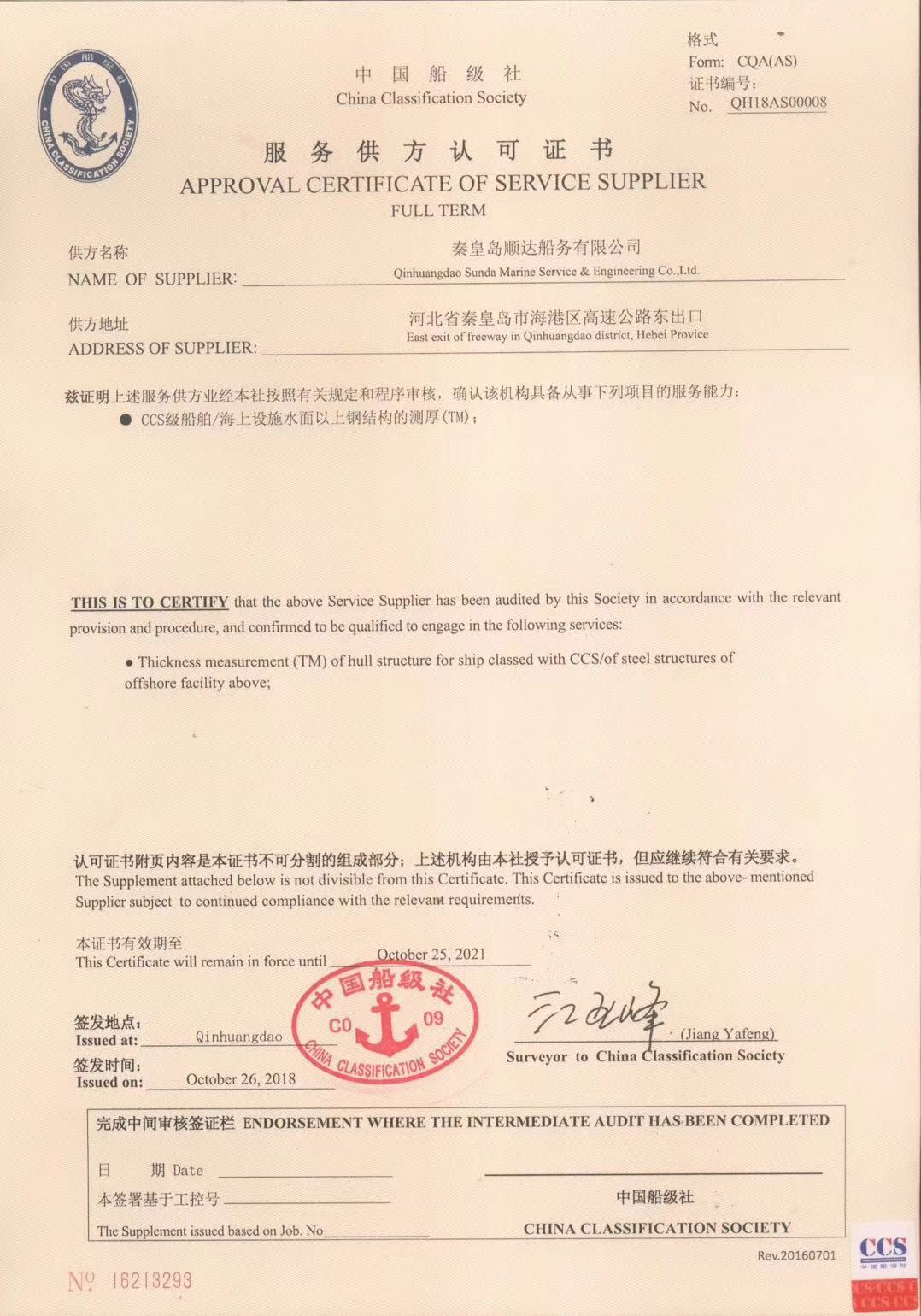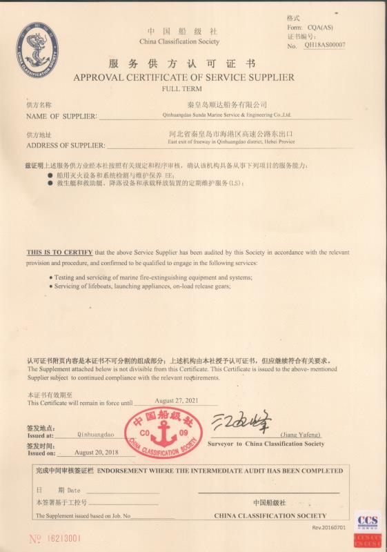 秦皇島順達船務有限公司位于美麗的海濱城市、中國北方著名的能源輸出大港--秦皇島。公司從事于船舶修理、物料供應、水下檢測、船體測厚、消防救生設備及救生艇檢驗、電氣自動化修理等服務。 公司自1997年成立至今,先后為國內(nèi)外船東修理、檢驗各類船舶萬余艘,積累了豐富的施工經(jīng)驗。公司現(xiàn)有場地100余畝,員工30余人,以及工程用車若干臺。我們公司一直本著嚴以律己、真誠待人、精益求精、信譽至上的經(jīng)營理念,以優(yōu)質的服務、專業(yè)的施工、合理的收費,得到了國內(nèi)外船東的廣泛認可,贏得了良好的口碑和信譽。 公司已取得了中國船級社(CCS)、美國船級社(ABS)、日本船級社(NK)、德國船級社(DNV GL)等各個船級社的消防救生和救生艇檢驗資質, ...